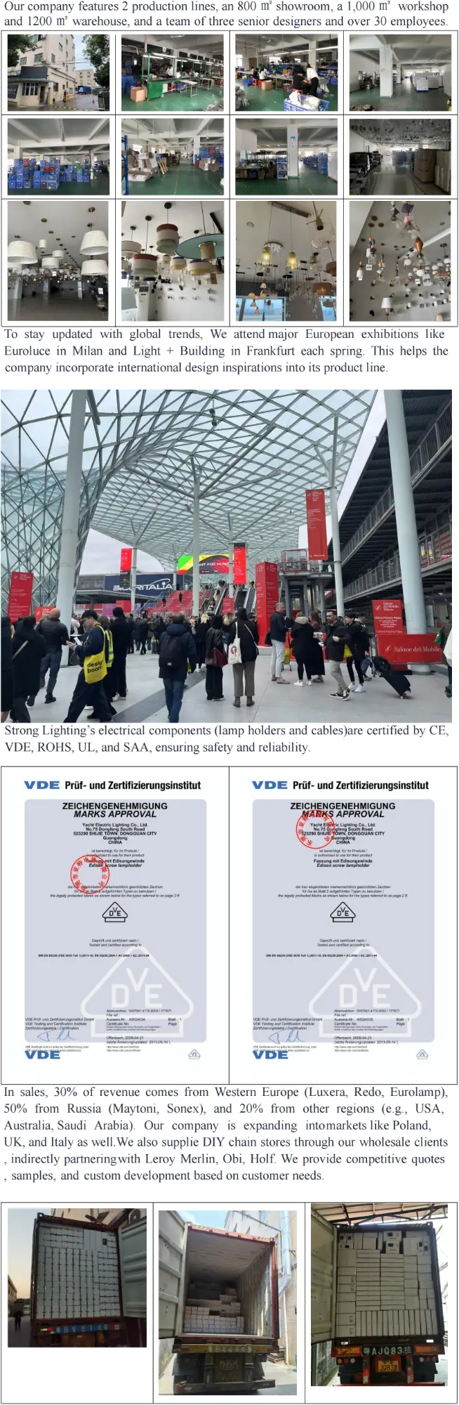 Med rod i Zhongshans Guzhen bybelysningshub henter Strong Lighting inspiration fra globale trends på Milan Euroluce- og Frankfurt Light + Building-udstillinger, hvilket sikrer, at vores design er foran industriens kurver. Vores 1.000㎡ værksted og dobbelte produktionslinjer understøtter en årlig produktion på 100 x 40HQ containere, hvilket gør os i stand til at håndtere store bulkordrer med ensartet kvalitet.