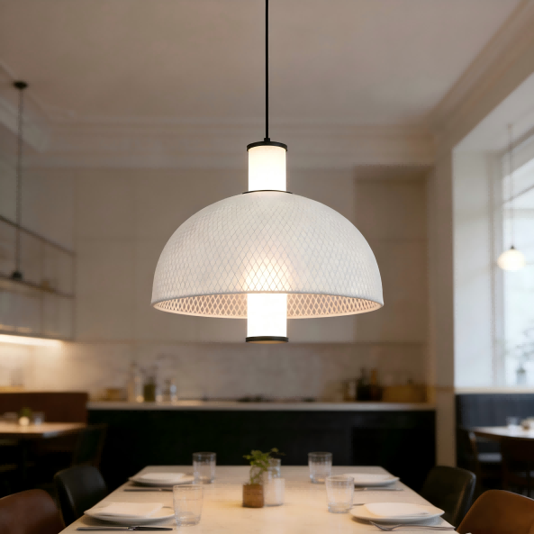 Inspireret af de banebrydende designtrends på Euroluce-udstillingen i Milano 2025, blander denne minimalistiske italienske pendellampe i silkemesh fra Strong Lighting problemfrit italiensk minimalisme med praktisk funktionalitet. Den centrale 15W LED-lyskilde udsender et 4000K neutralt lys, hvilket skaber en behagelig atmosfære. Med en lysstyrke på 1500LM og et højt farvegengivelsesindeks på Ra>80 er lyset naturligt og naturtro, hvilket gør det velegnet til stuer, spisestuer og andre rum. Den runde bueformede lampeskærm er lavet af jernnet viklet omkring hvidt silkestof, og det mat sorte hardware er afsluttet med en spraymalingsproces for at tilføje tekstur. Det enkle design integreres nemt i nordiske, moderne og andre boligstile.